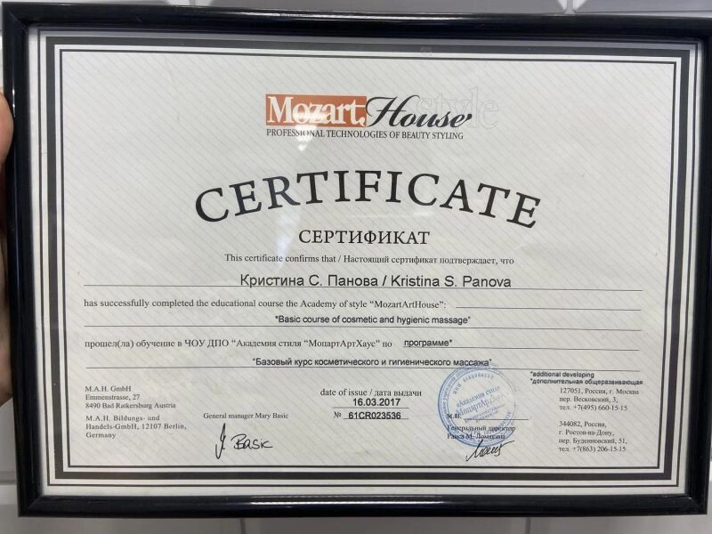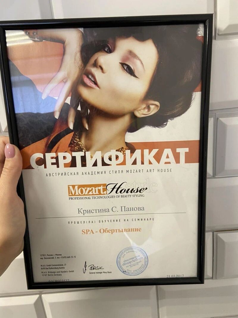 - Австрийская академия стиля Mozart art house, SPA-обертывание (с 2017 г.).