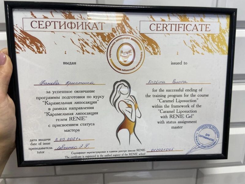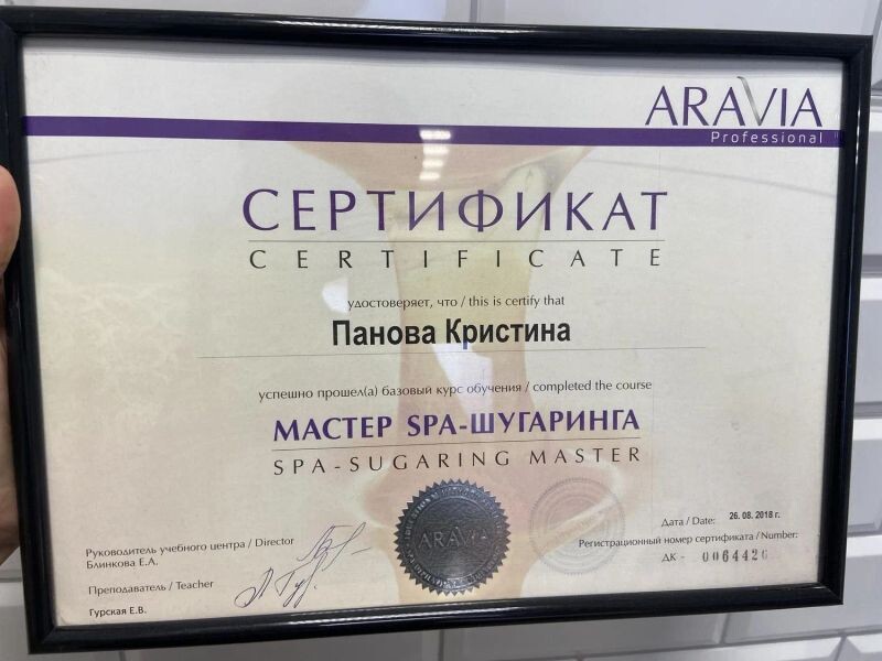 - Сертификат, мастер spa-шугаринга, 2018 г.