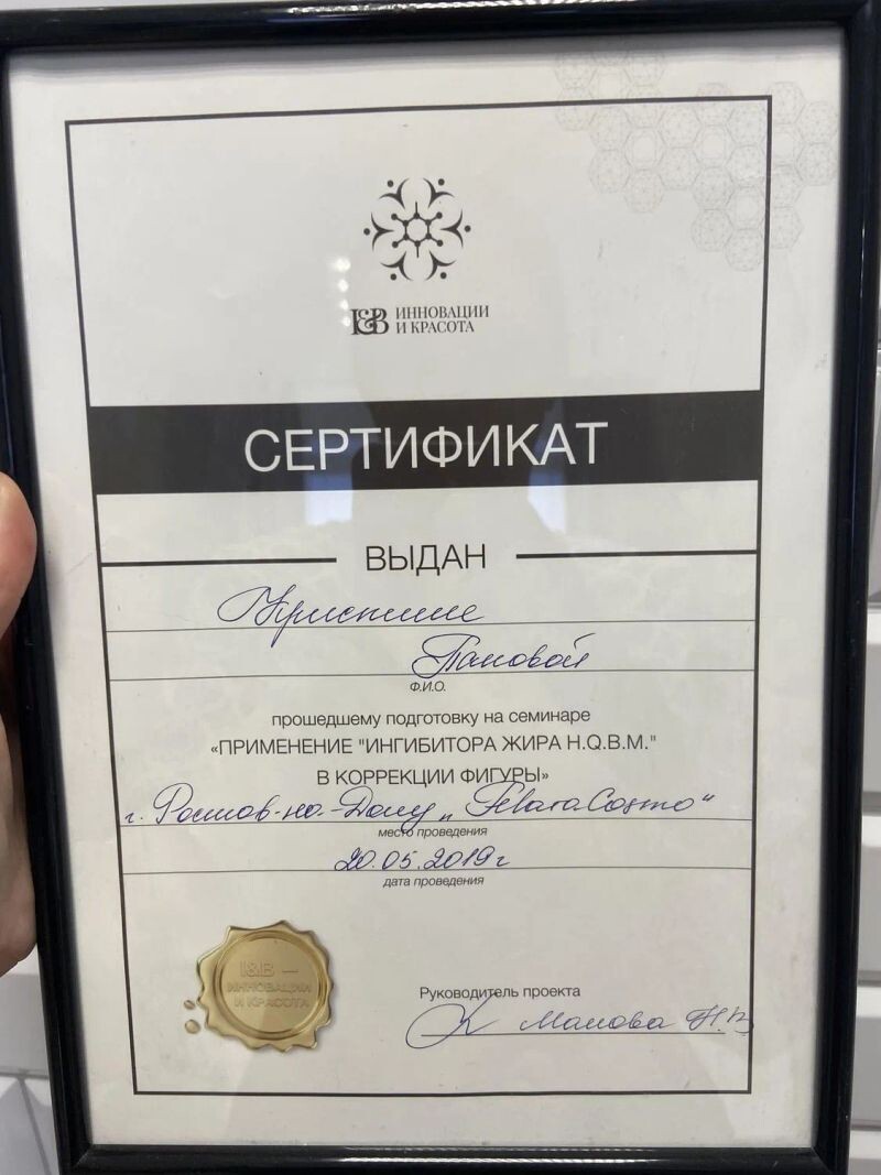 - Сертификат, применение ингибитора жира HQBM в коррекции фигуры, 2019 г.