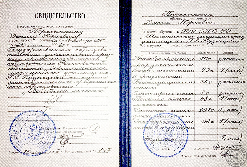 - Шахтинский медицинский колледж, специальность – сестринское дело (2007 г.), обучение лечебному массажу (2006 г.).
