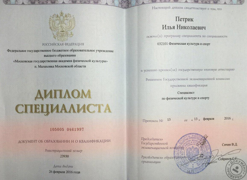- Московская государственная академия физической культуры, специалист по физической культуре и спорту (Московская область, п. Малаховка, 2016 г.).