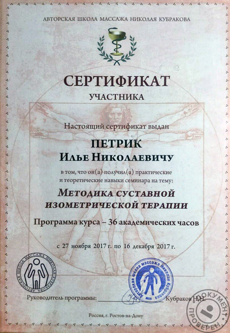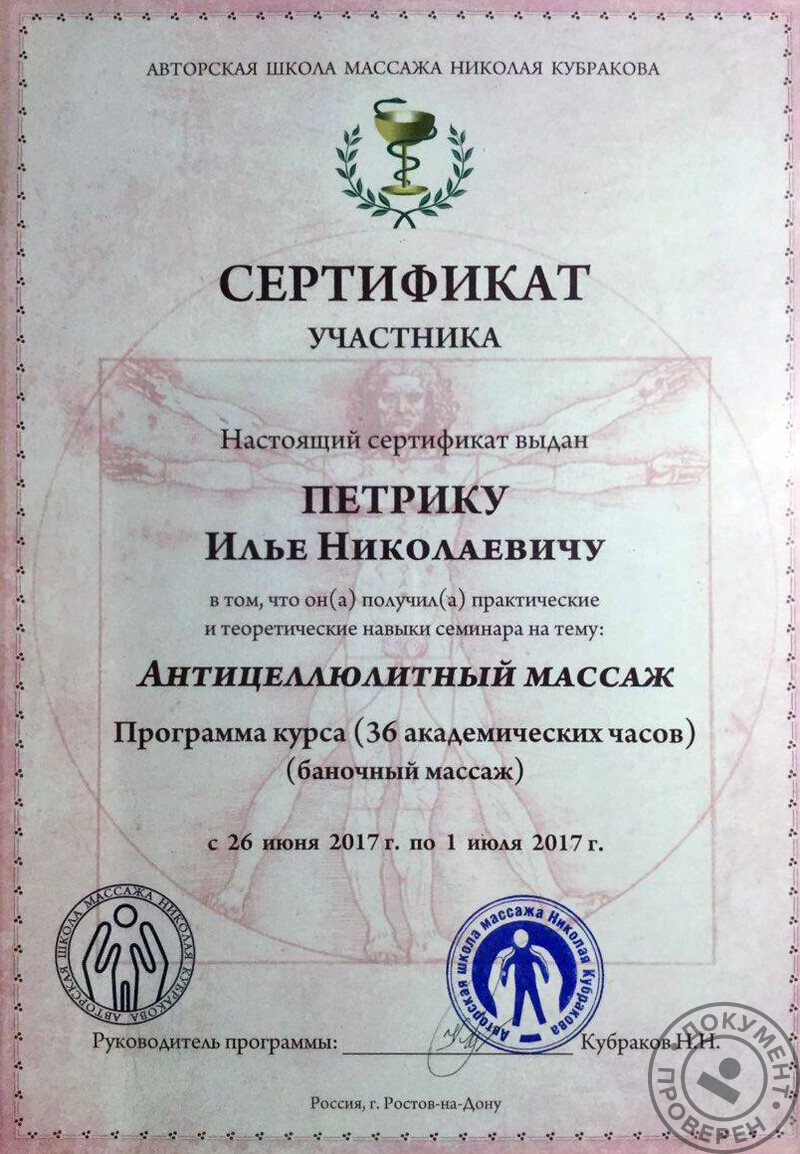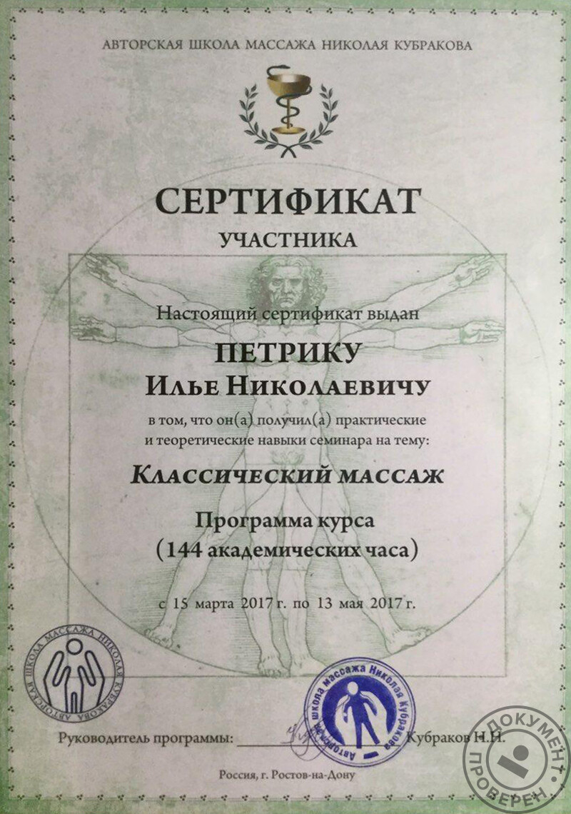 - Авторская школа массажа Николая Кубракова, классический массаж, методика суставной изометрической терапии, антицеллюлитный массаж (2017 г.).