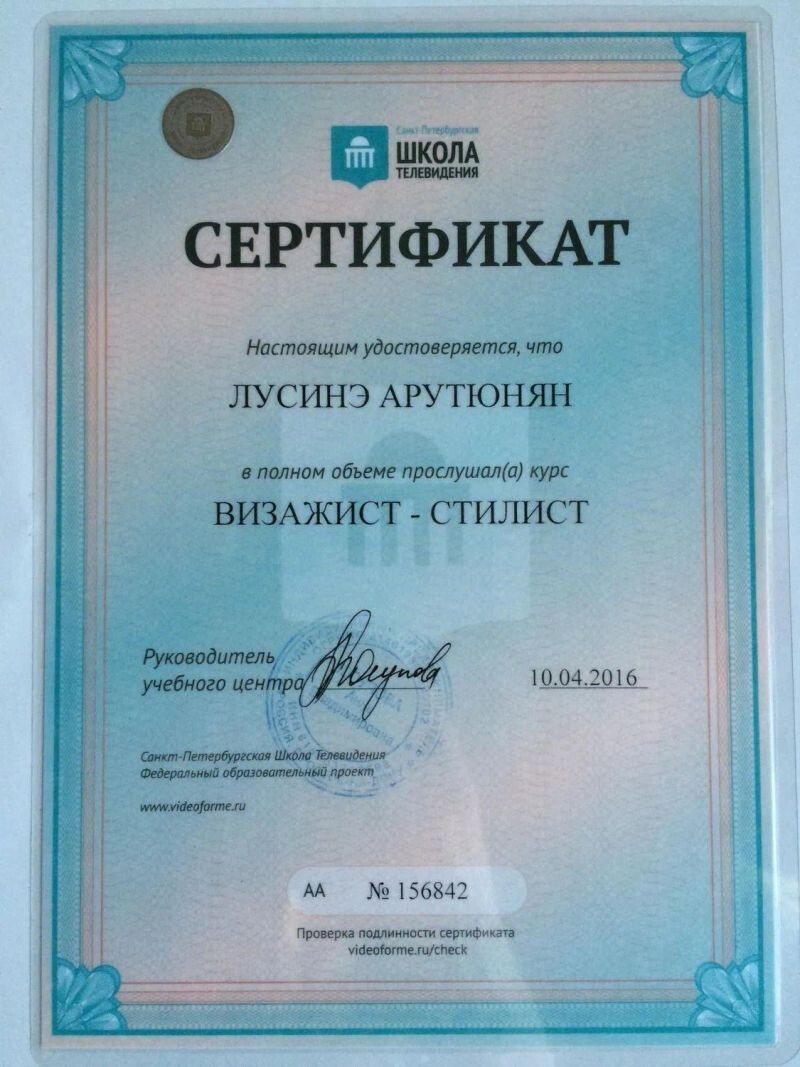 - Санкт-Петербургская школа телевидения, визажист-стилист, 2015–2016 гг.