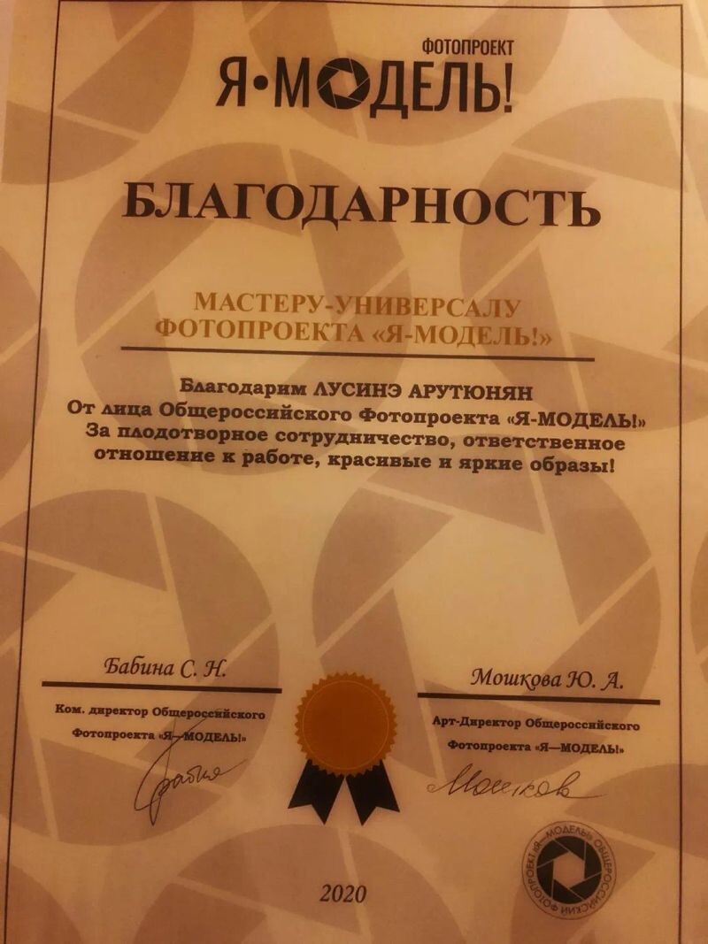 - Благодарственное письмо от фотопроекта «Я — модель!», 2020 г.