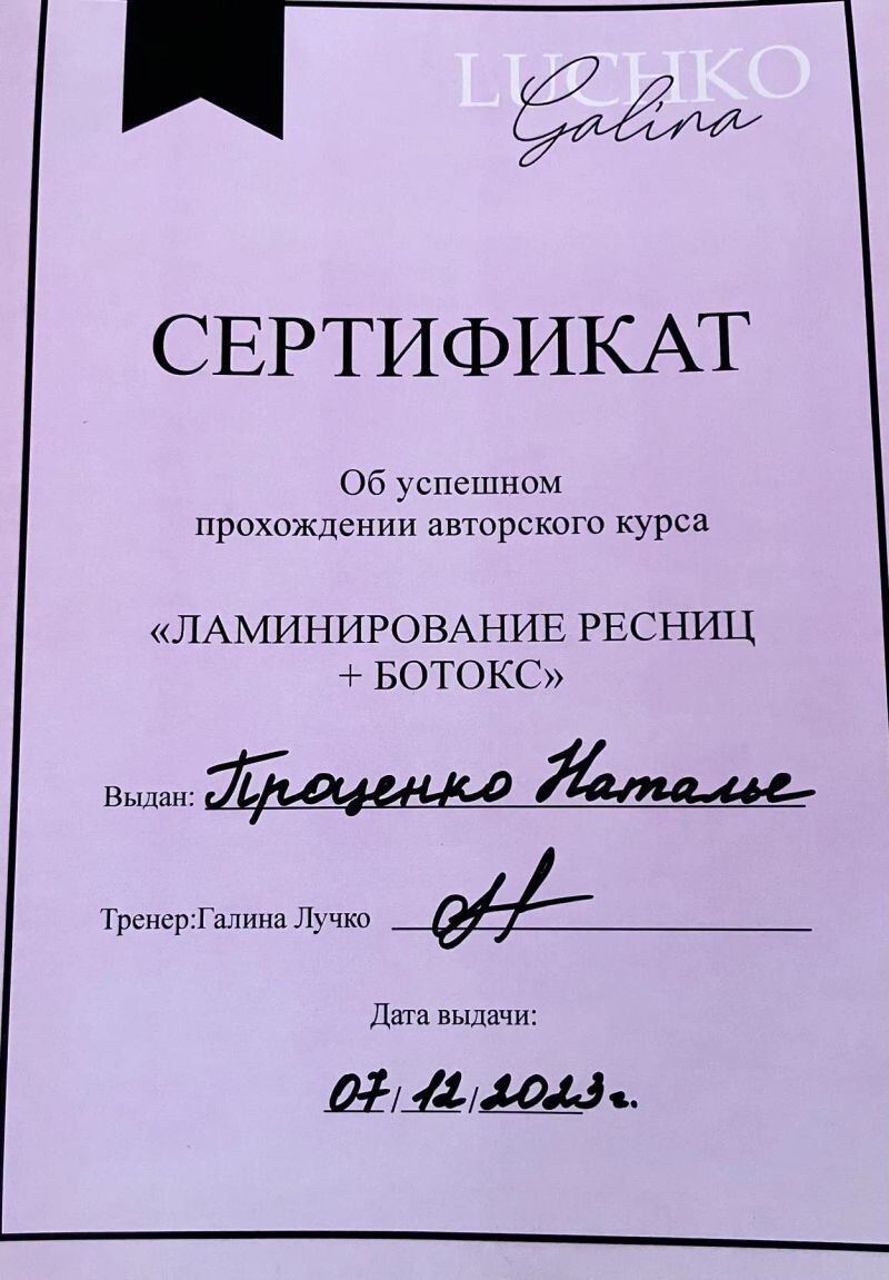 - Авторский курс Галины Лучко «Ламинирование ресниц + ботокс», 2023 г.