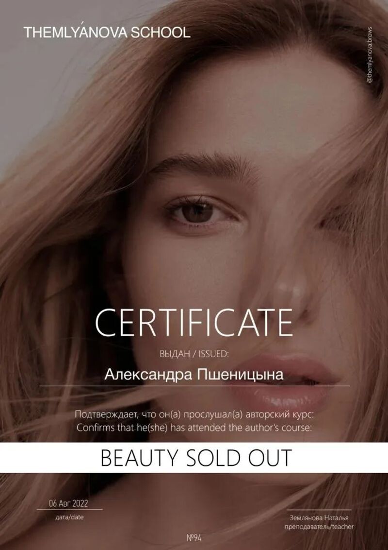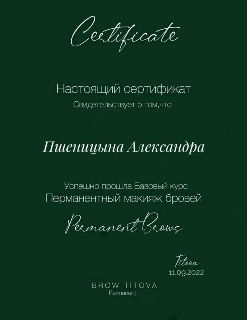 - Brow Titova parlament, сертификат о прохождении базового курса по перманентному макияжу бровей, 2022 г.