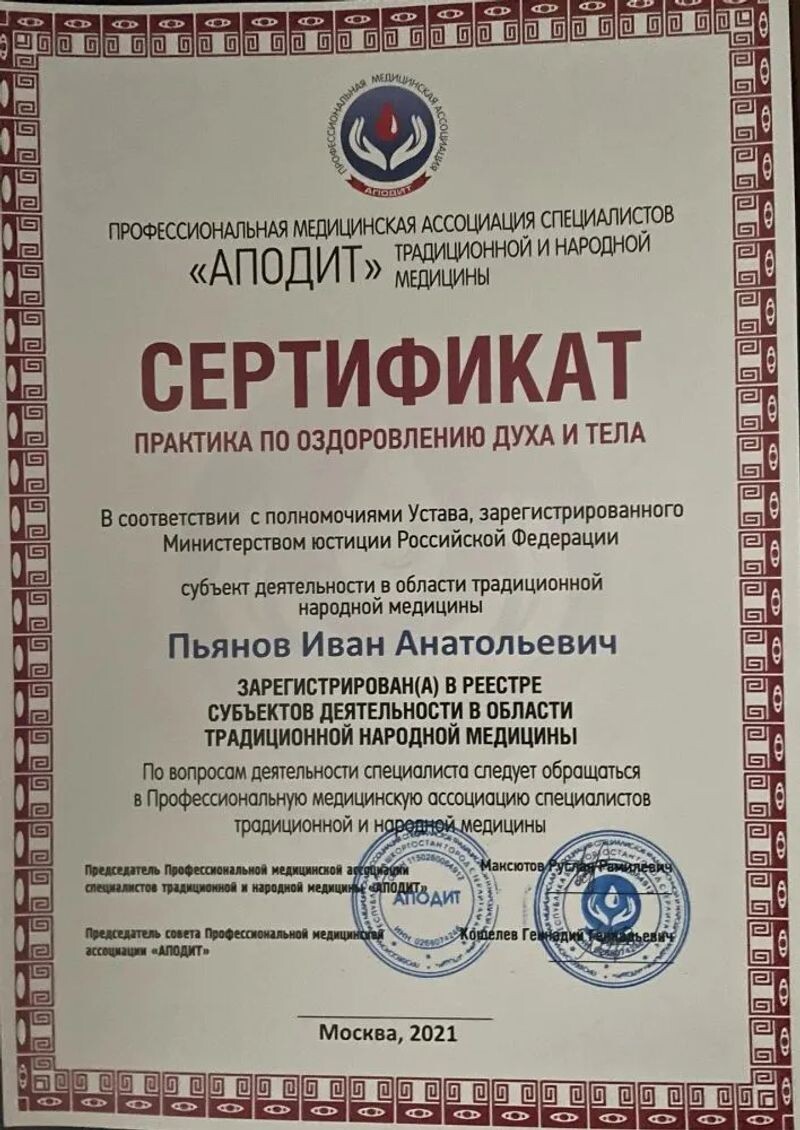 - «Аподит», регистрация в реестре субъектов деятельности в области традиционной народной медицины, 2021 г.