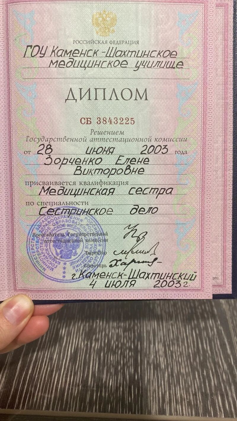 - ГОУ Каменск-Шахтинское медицинское училище, квалификация «медицинская сестра», специальность «сестринское дело», 2000–2003 гг.