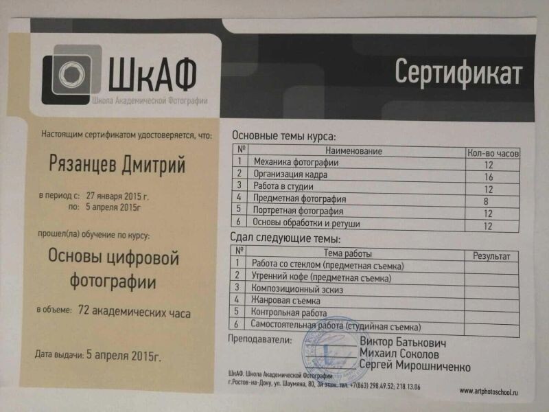 - Школа академической фотографии, основы цифровой фотографии, 2015 г.