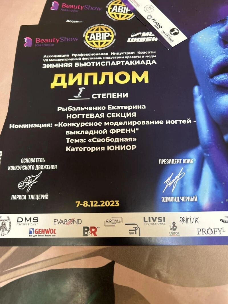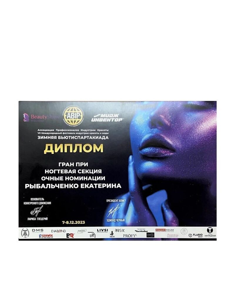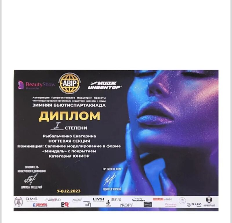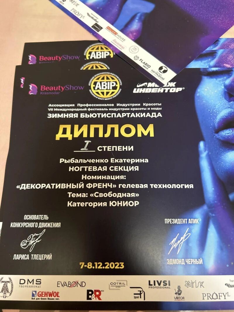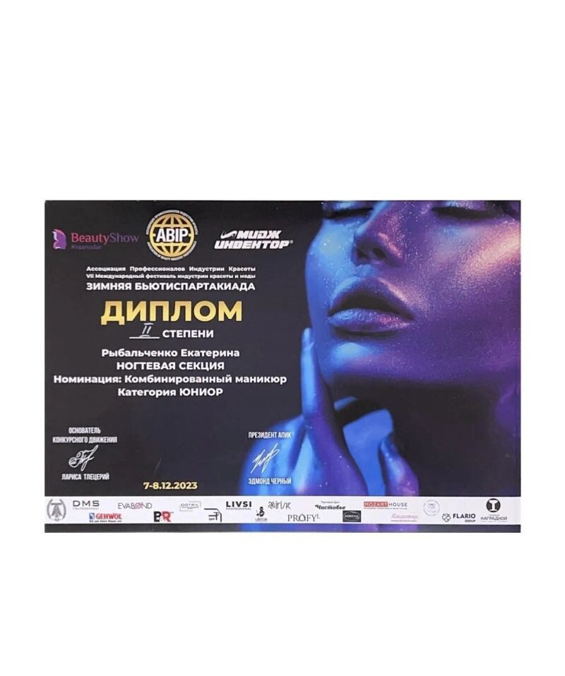 - VII Международный фестиваль индустрии красоты и моды, диплом I степени в номинации «Конкурсное моделирование ногтей – выкладной френч», 2023 г.
