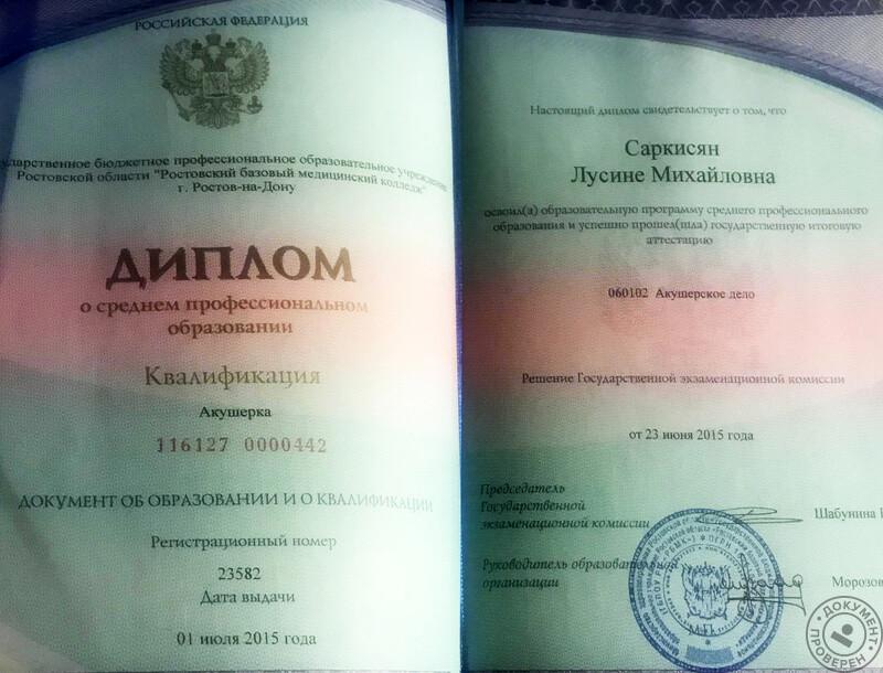 - Ростовское медицинское училище, акушерское дело (2015 г.).