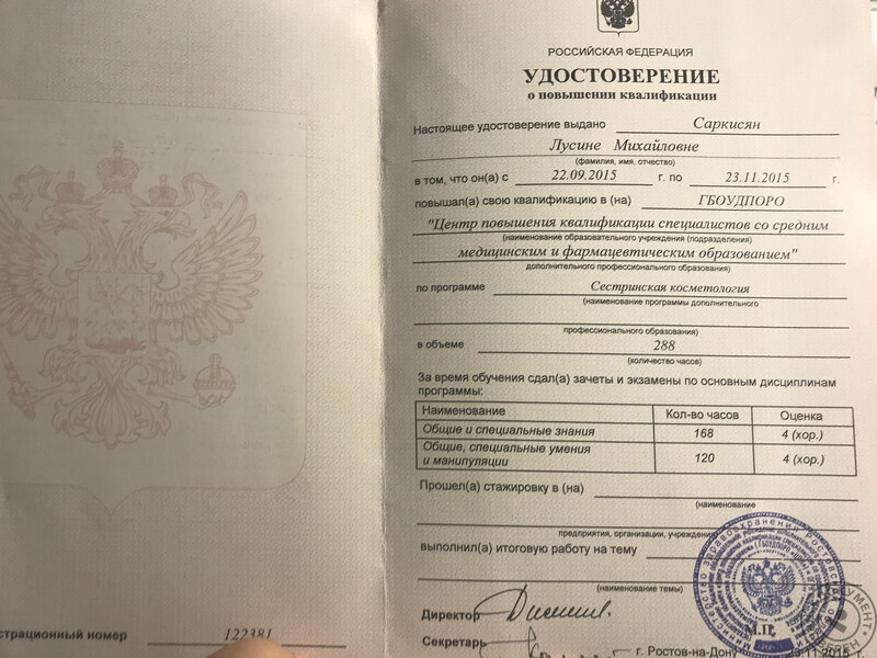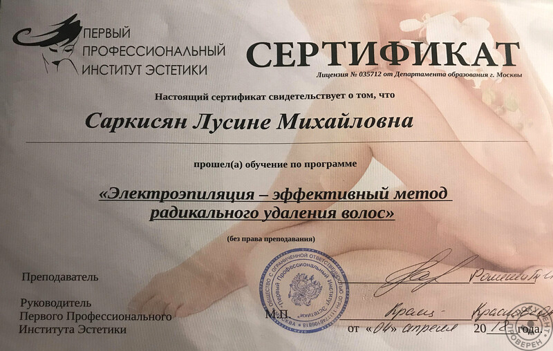 - Первый профессиональный институт эстетики, электроэпиляция (2018 г.).