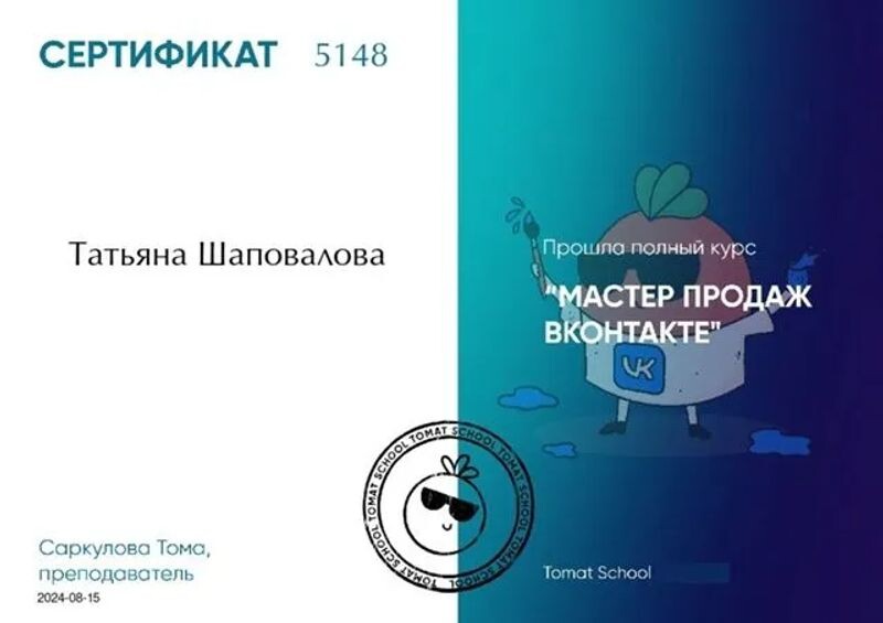 - Мастер продаж Вконтакте, Школа Томат, 2024–2025 гг.