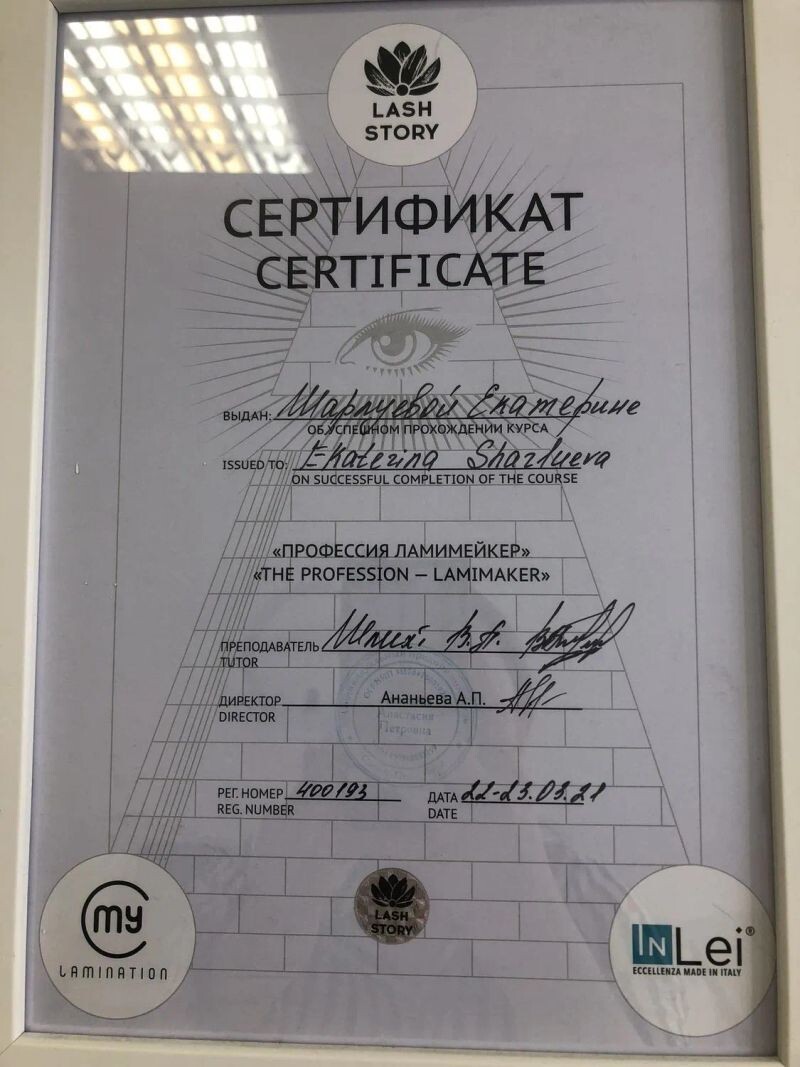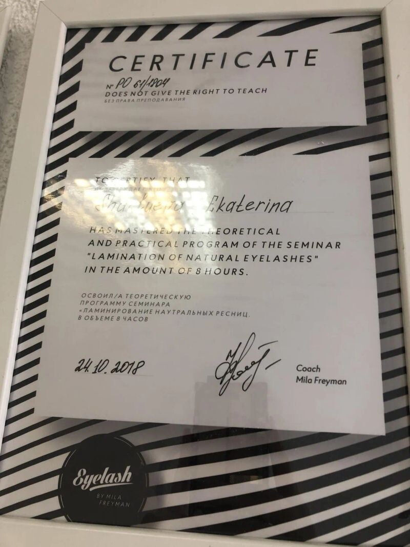 - Курс «Ламинирование натуральных ресниц», 2018 г.