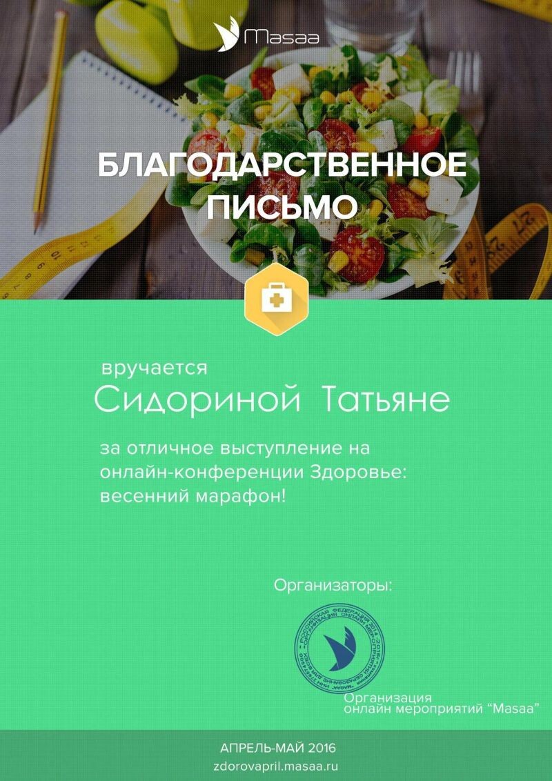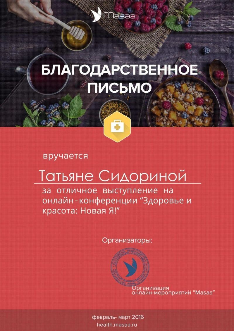 - Благодарственное письмо за отличное выступление на онлайн-конференции «Здоровье и красота: новая я», 2016 г.