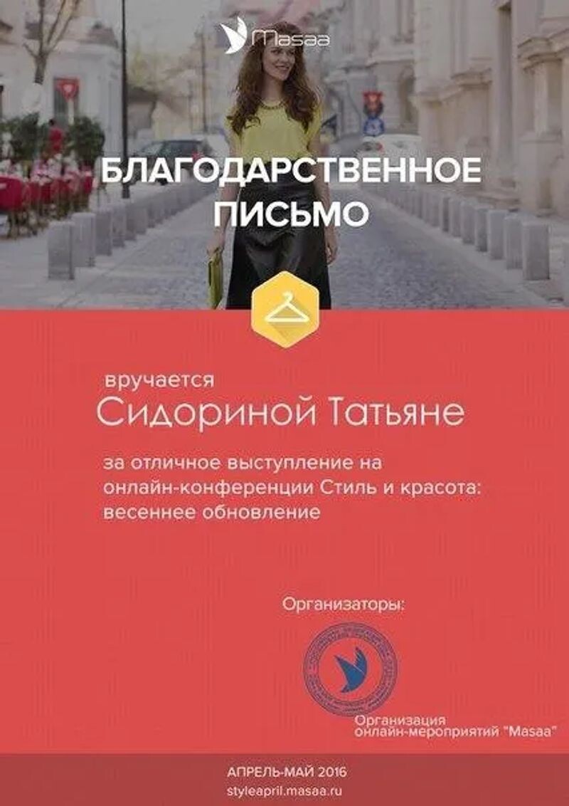 - Благодарственное письмо за отличное выступление на онлайн-конференции «Стиль и красота: весеннее обновление», 2016 г.