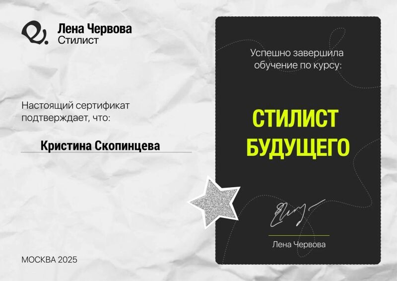- Институт развития профессиональных компетенций «Стилист» Предоставление услуг по разработке (подбору) моделей одежды (с 2025 г.).