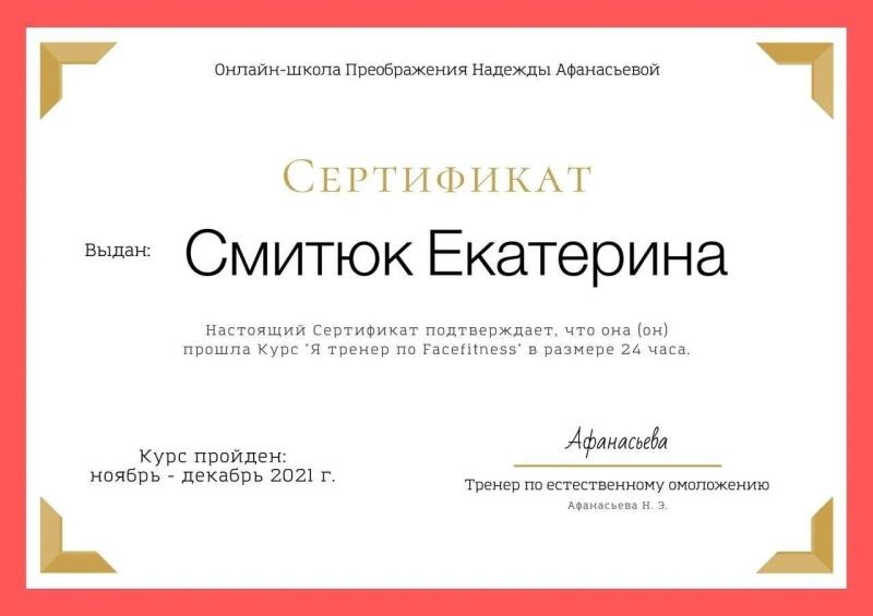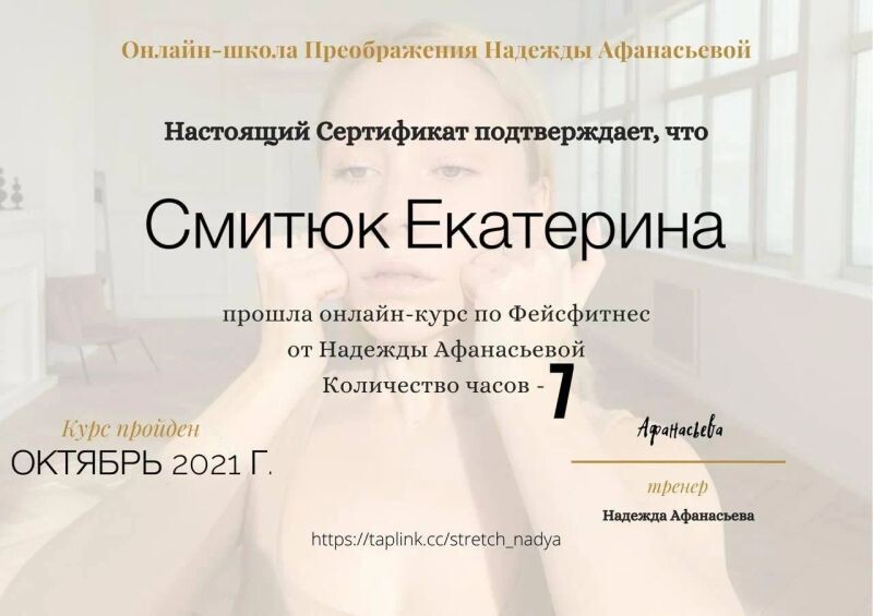 - Онлайн-школа преображения Надежды Афанасьевой, курс «Я тренер по фейсфитнесу», 2021 г.