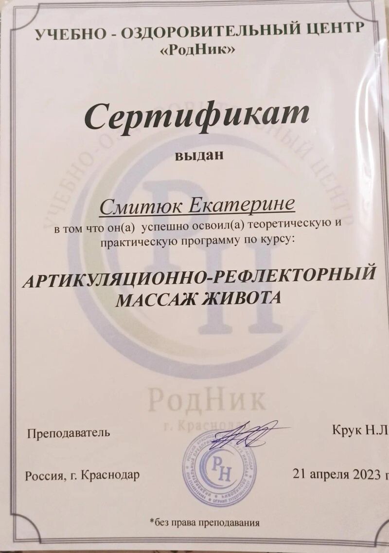 - Учебно-оздоровительный центр «РодНик», курс «Артикуляционно-рефлекторный массаж живота», 2023 г.