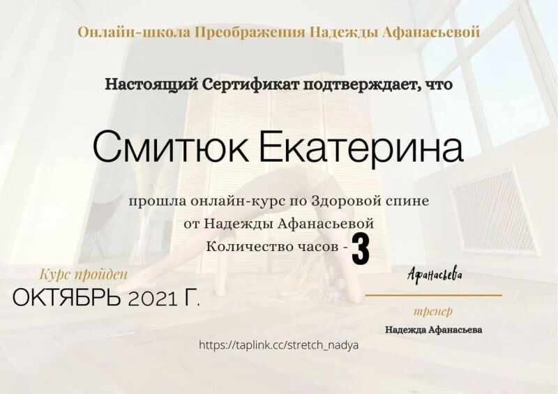 - Онлайн школа преображения Надежды Афанасьевой, курс «Здоровая спина», 2021 г.