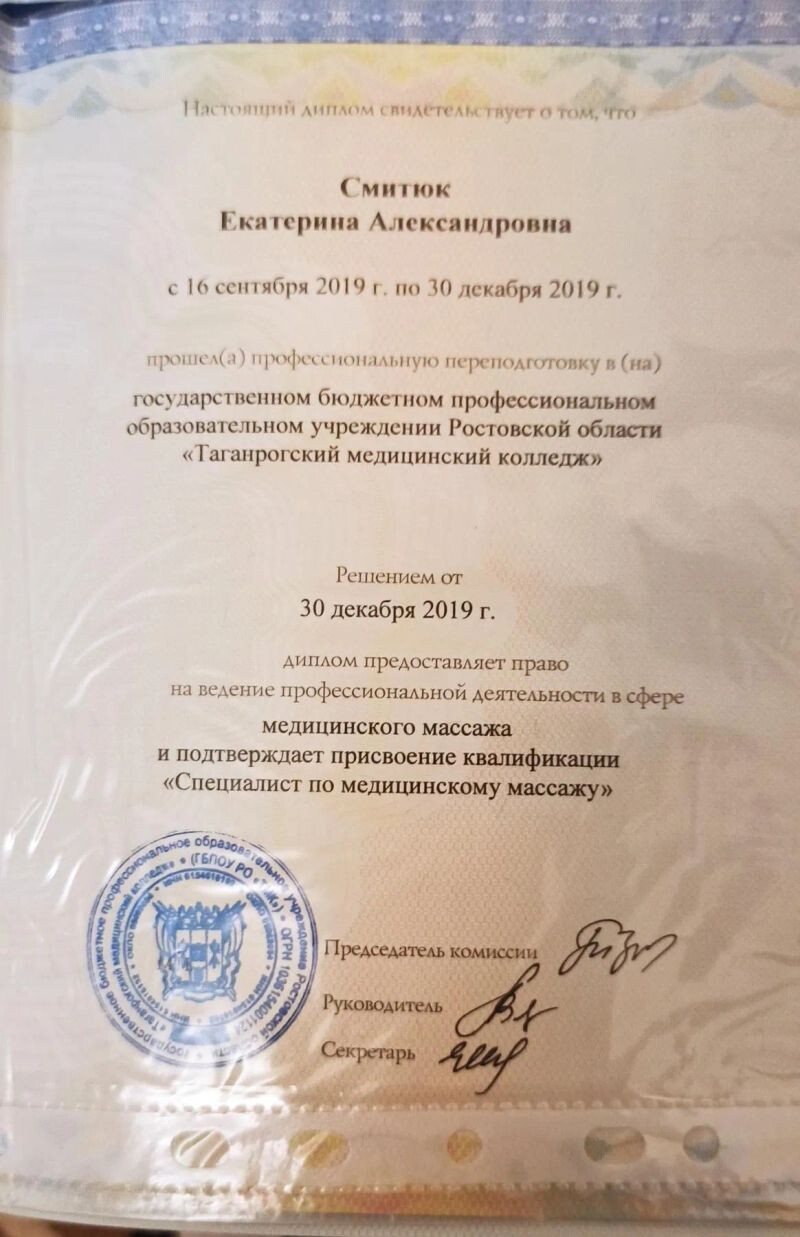 - Таганрогский медицинский колледж, квалификация «специалист по лечебному массажу», 2019 г.