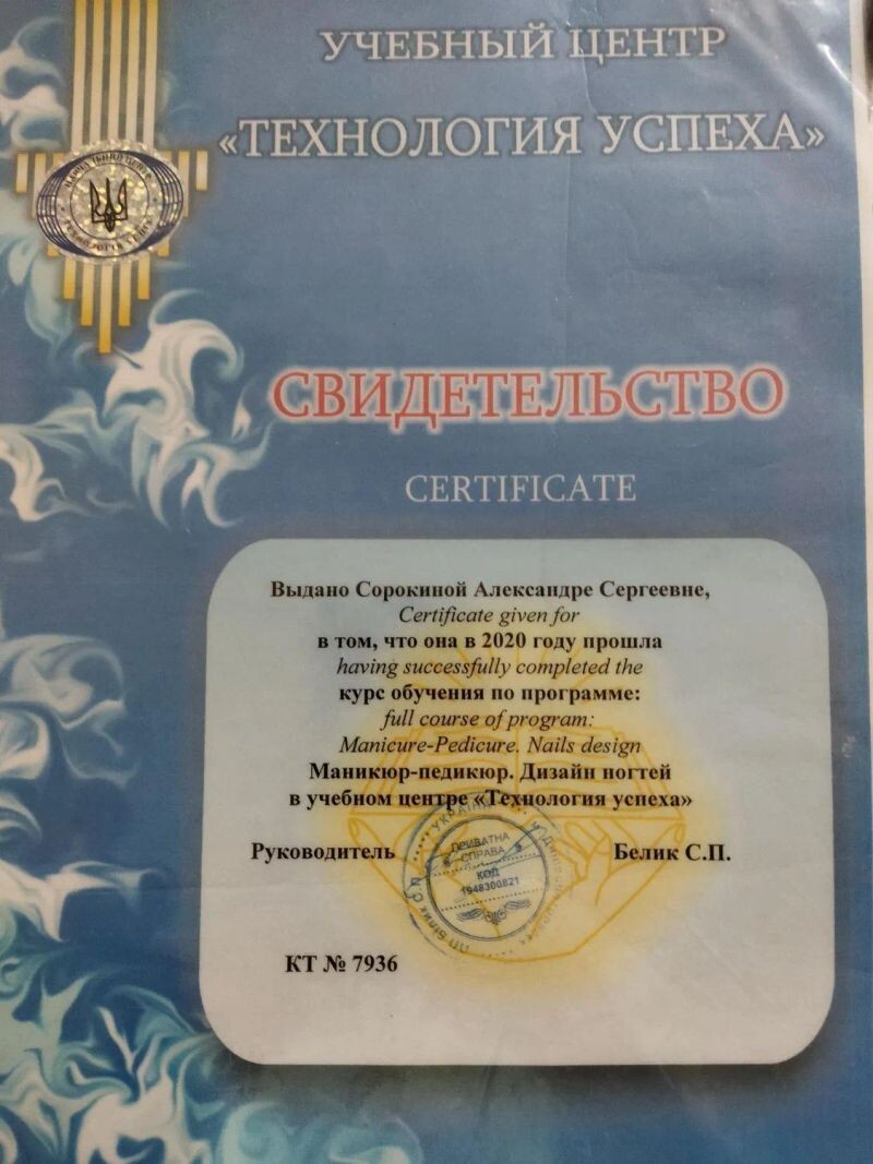 - Технология успеха, курс «Маникюр, педикюр», 2020 г.