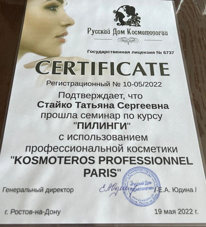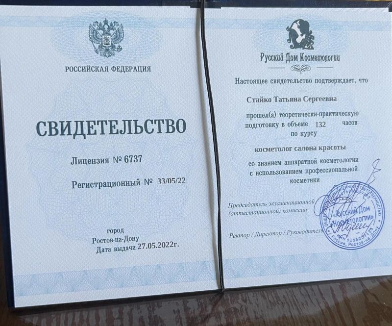 - ООО «Русский Дом Косметологии», курс «Косметолог салона красоты», 2022 г.