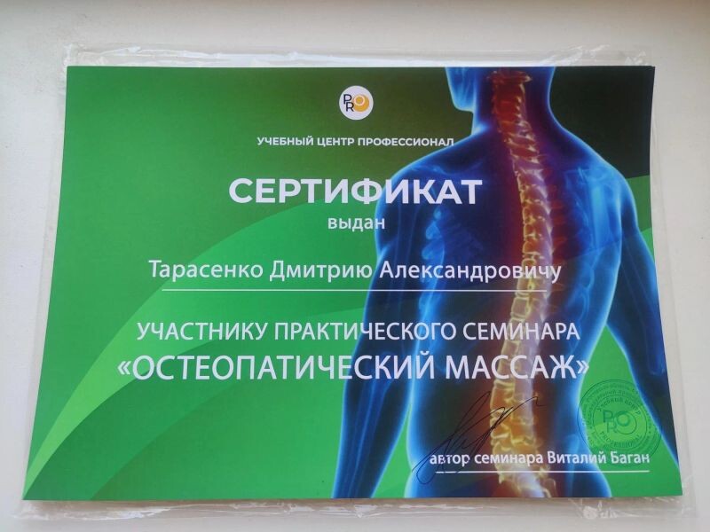 - Учебный центр «Профессионал», остеопатический массаж, 2021 г.