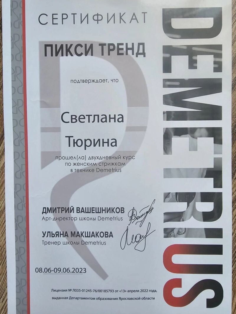 - Школа «Деметриус», курс по женским стрижкам в технике Demetrius, 2023 г.