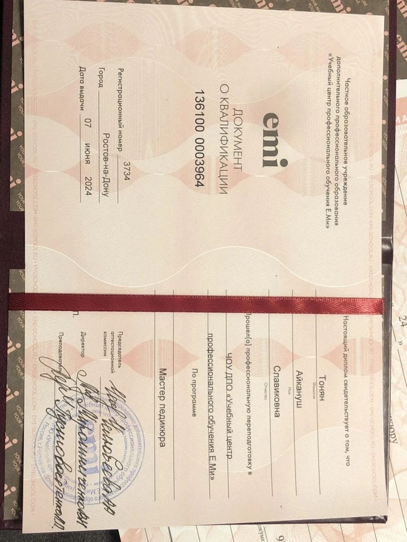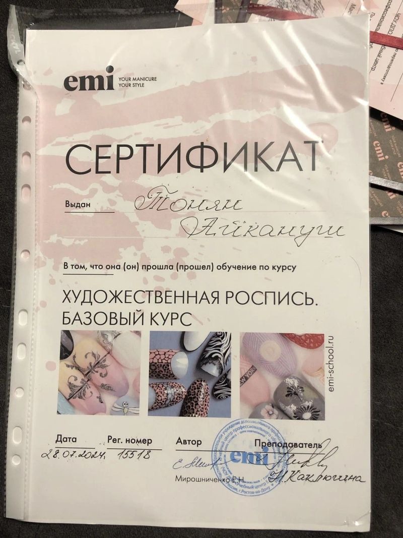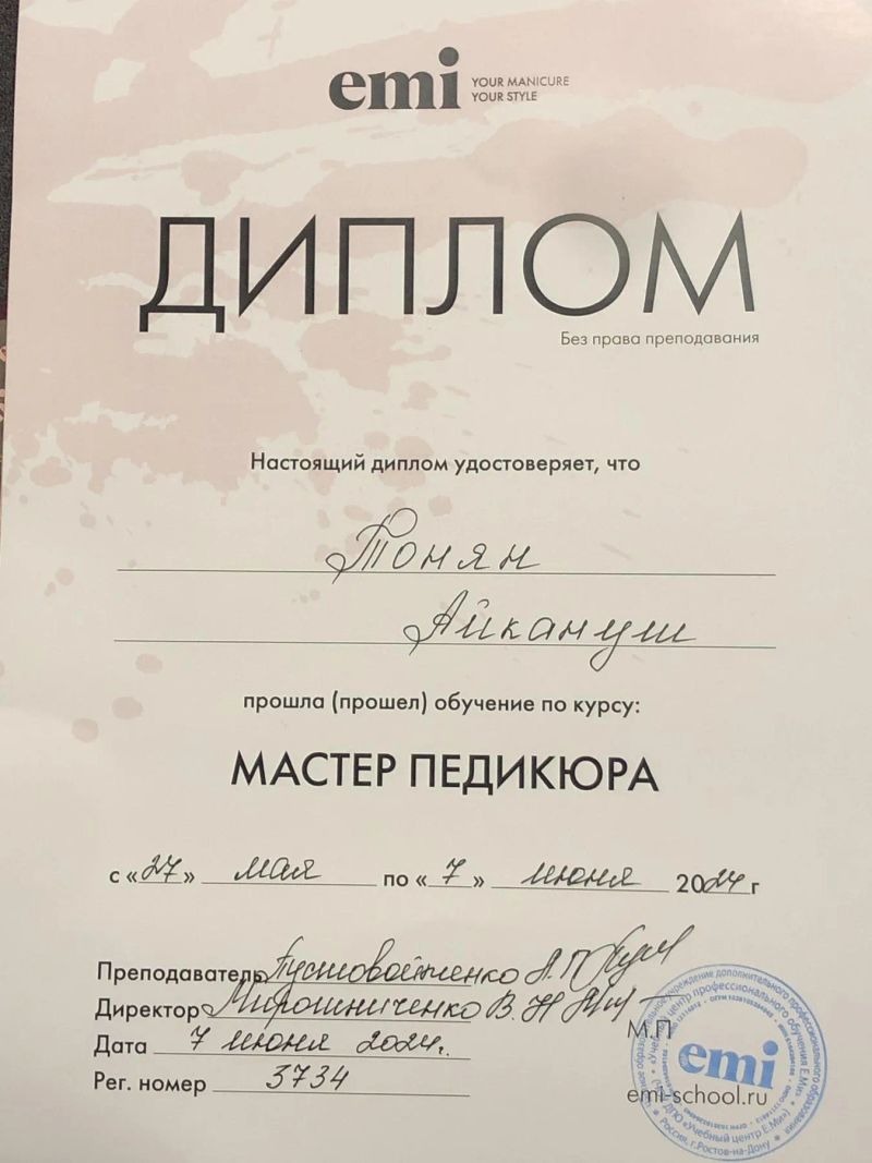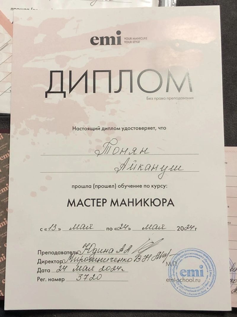 - ДИПЛОМ «СПЕЦИАЛИСТ ПО МАНИКЮРУ», 2024 г.