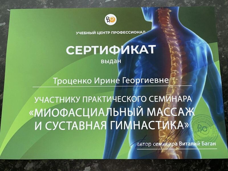 - УЦ «Профессионал», семинар «Миофасциальный массаж и суставная гимнастка», 2023 г.