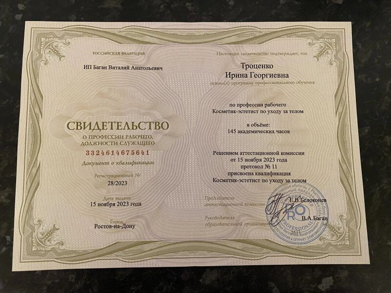 - ИП Баган Виталий Анатольевич, программа профессионального обучения по профессии «косметик-эстетист по уходу за телом», 2023 г.