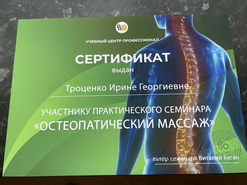 - УЦ «Профессионал», семинар «Остеопатический массаж», 2023 г.