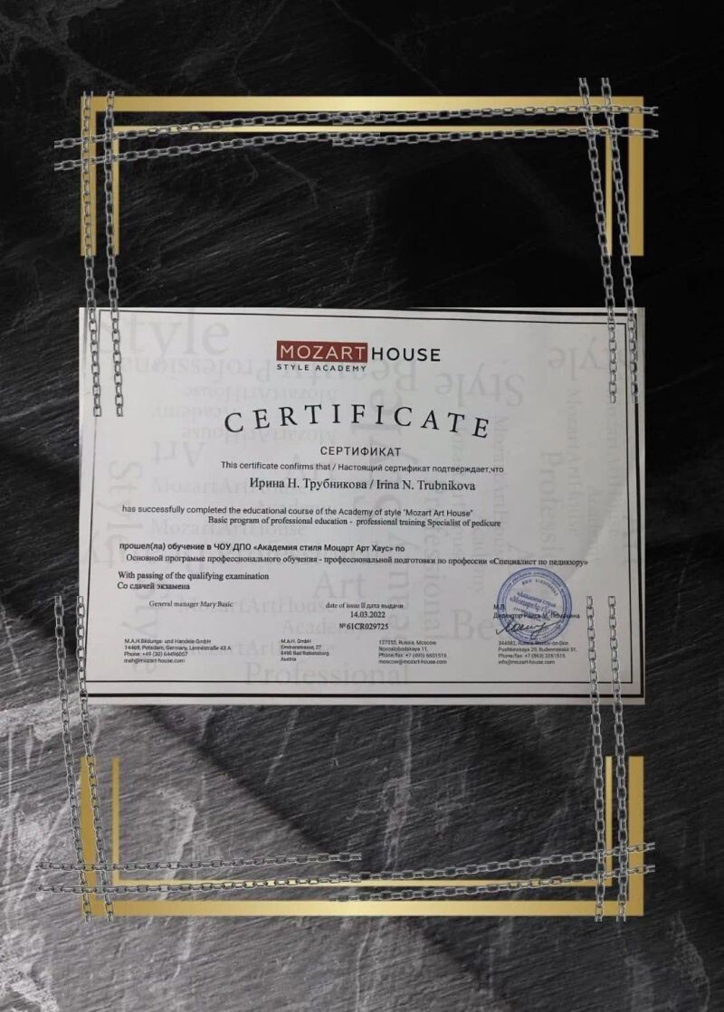 - ЧОУ ДПО «Академия стиля "Моцарт Арт Хаус"», специалист по педикюру, 2022 г.