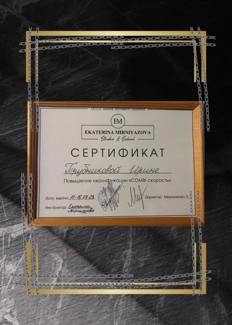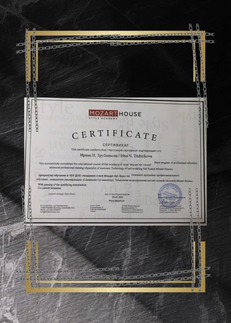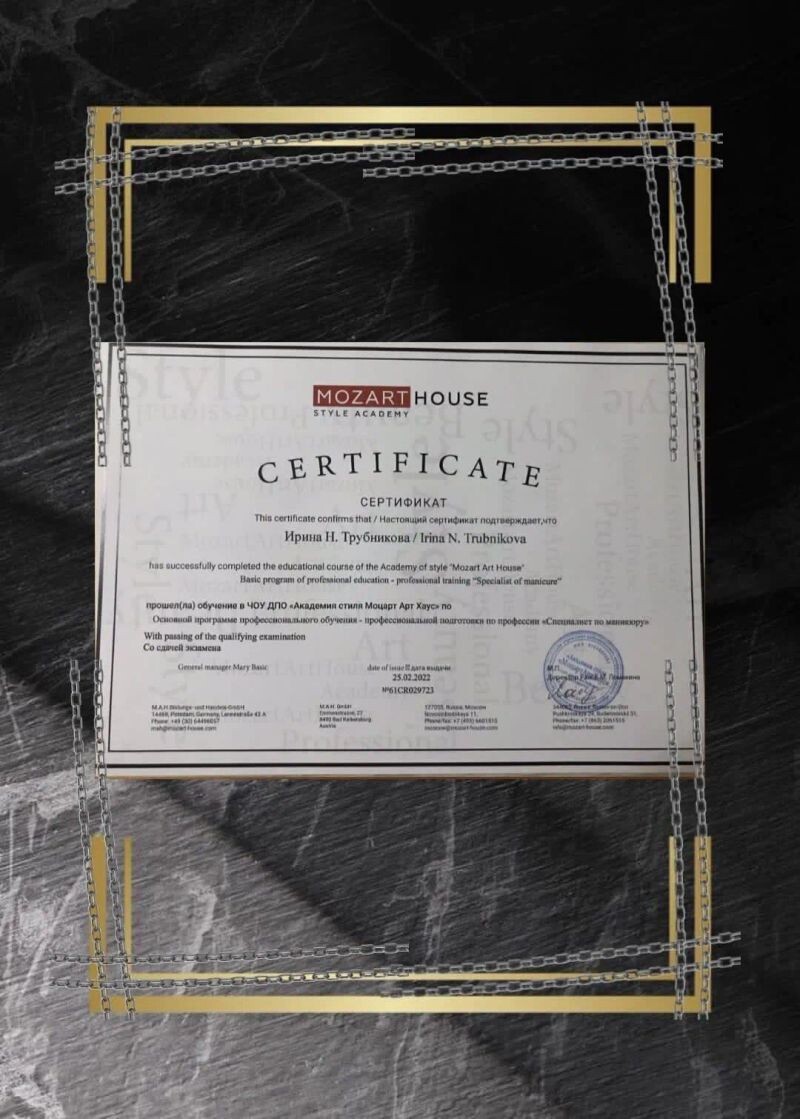 - ОУ ДПО «Академия стиля "Моцарт Арт Хаус"», специалист по маникюру, 2022 г.