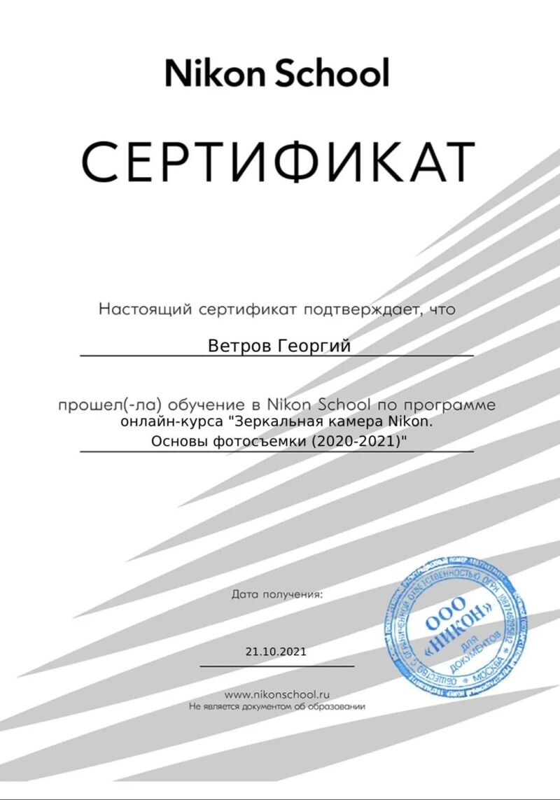 - Nikon School по программе онлайн-курса «Зеркальная камера Nikon. Основы фотосъемки(2020-2021)», 2022 г.