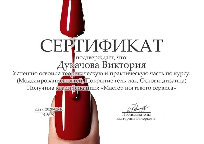 - Сертификат об окончании курсов «Моделирование ногтей», «Покрытие гель-лак», «Основы дизайна», квалификация «мастер ногтевого сервиса», 2020 г.
