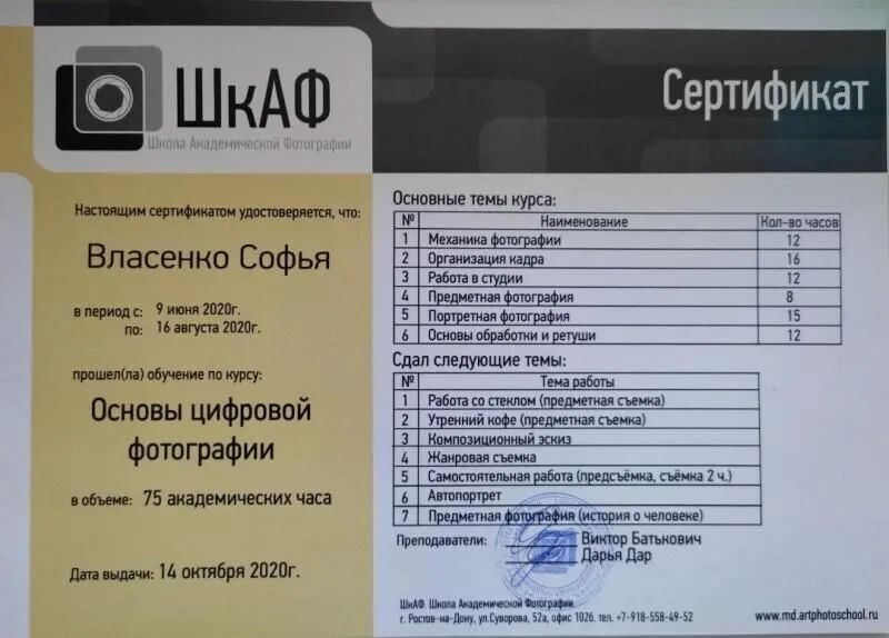 - «Основы цифровой фотографии», школа академической фотографии (ШкАФ), 2019 г.