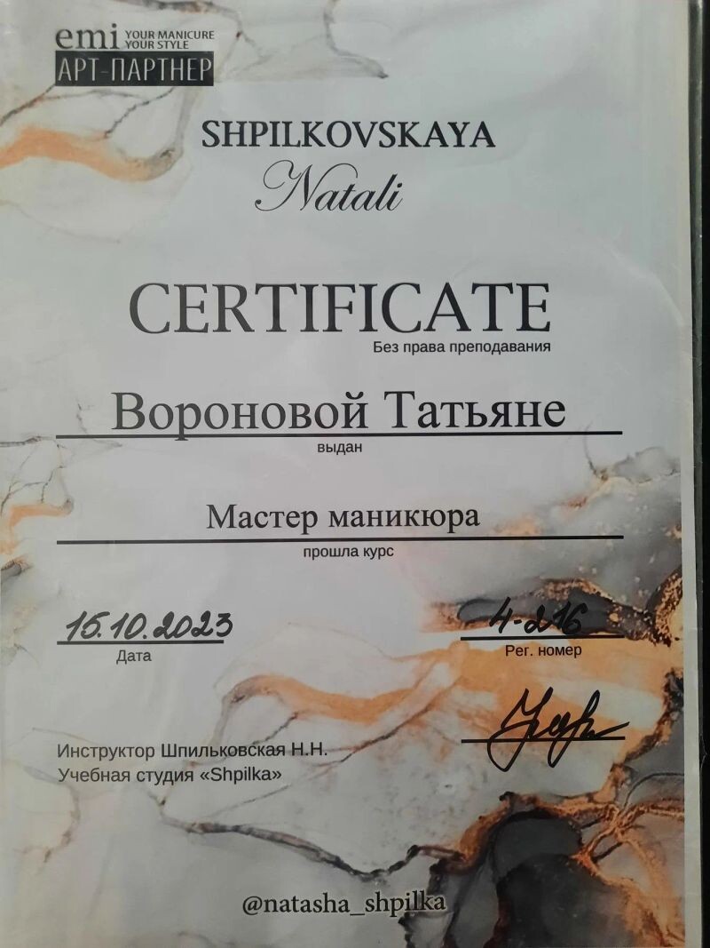 - SHPILKOVSKAYA NATALI, учебная студия Shpilka, мастер маникюра, 2023 г.