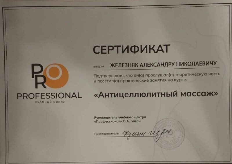 - Учебный центр "Профессионал", курс "Антицеллюлитный массаж", 2025 г.