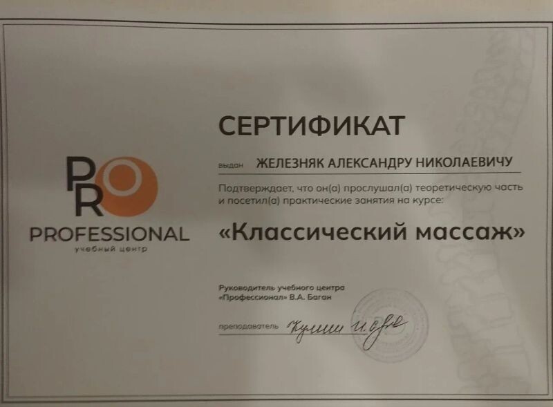 - Учебный центр "Профессионал", курс "Классический массаж", 2025 г.