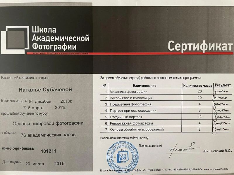 - Школа академической фотографии, курс «Основы цифровой фотографии», 2010–2011 гг.