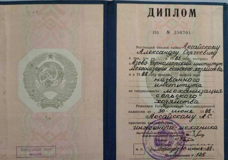 - Азово-Черноморский инженерый институт механизации сельского хозяйства, инженер-механик, 1983–1988 гг.