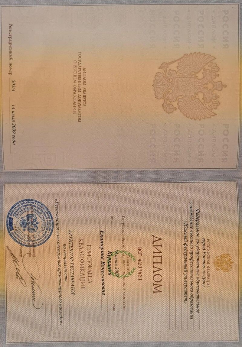 - Г. Ростов-на-Дону ФГОУ высшего профессионального образования «Южный федеральный университет», архитектор-реставратор, 2003–2009 гг.