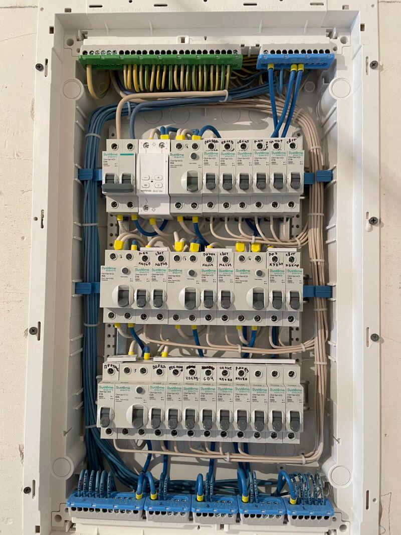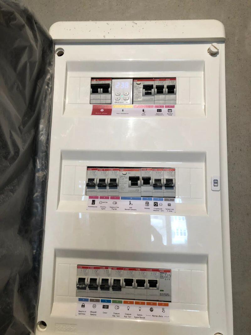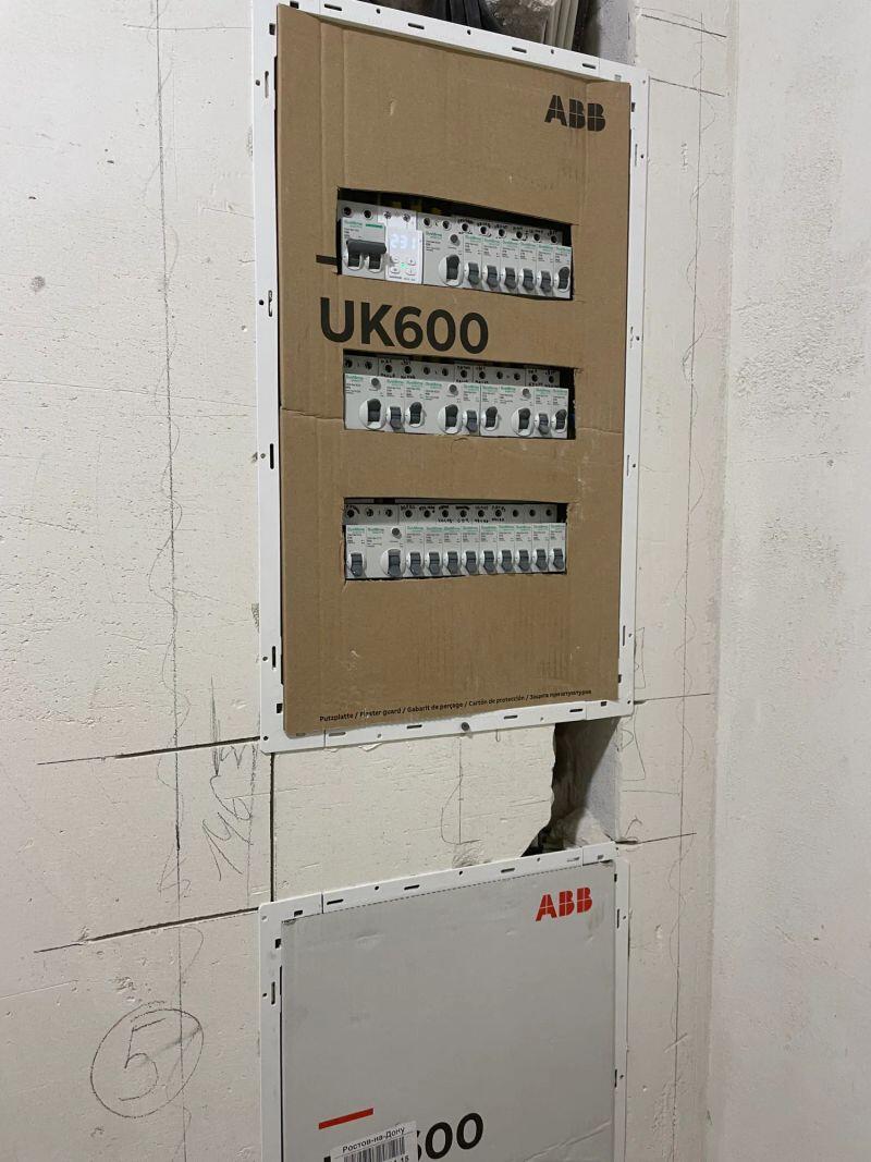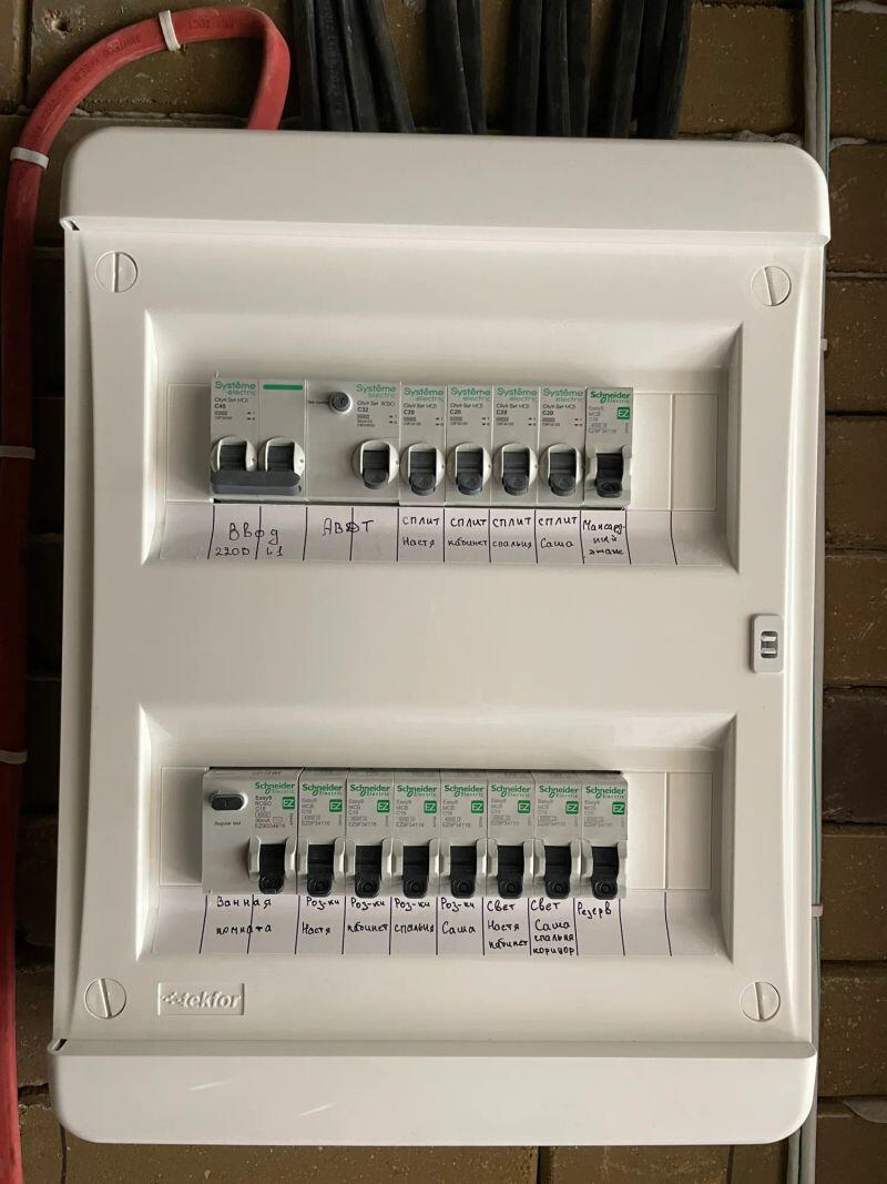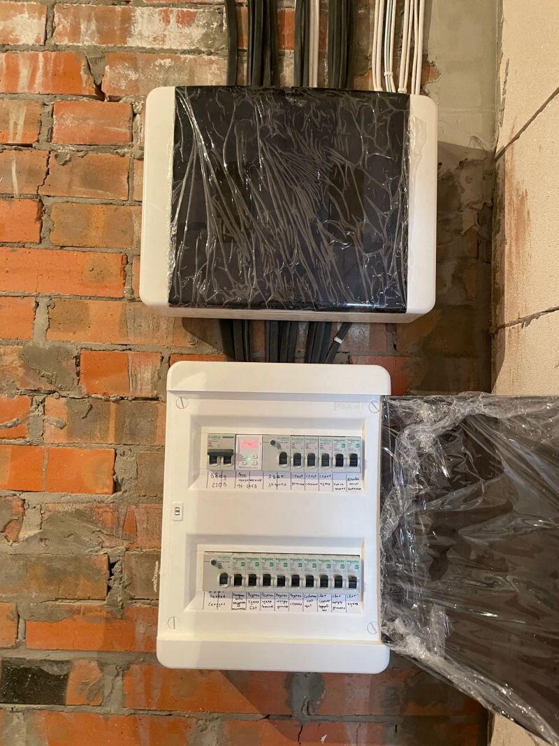 Полностью меняли проводку в студии (≈30 м²) от застройщика, добавляли розетки и выводы, меняли щиток.