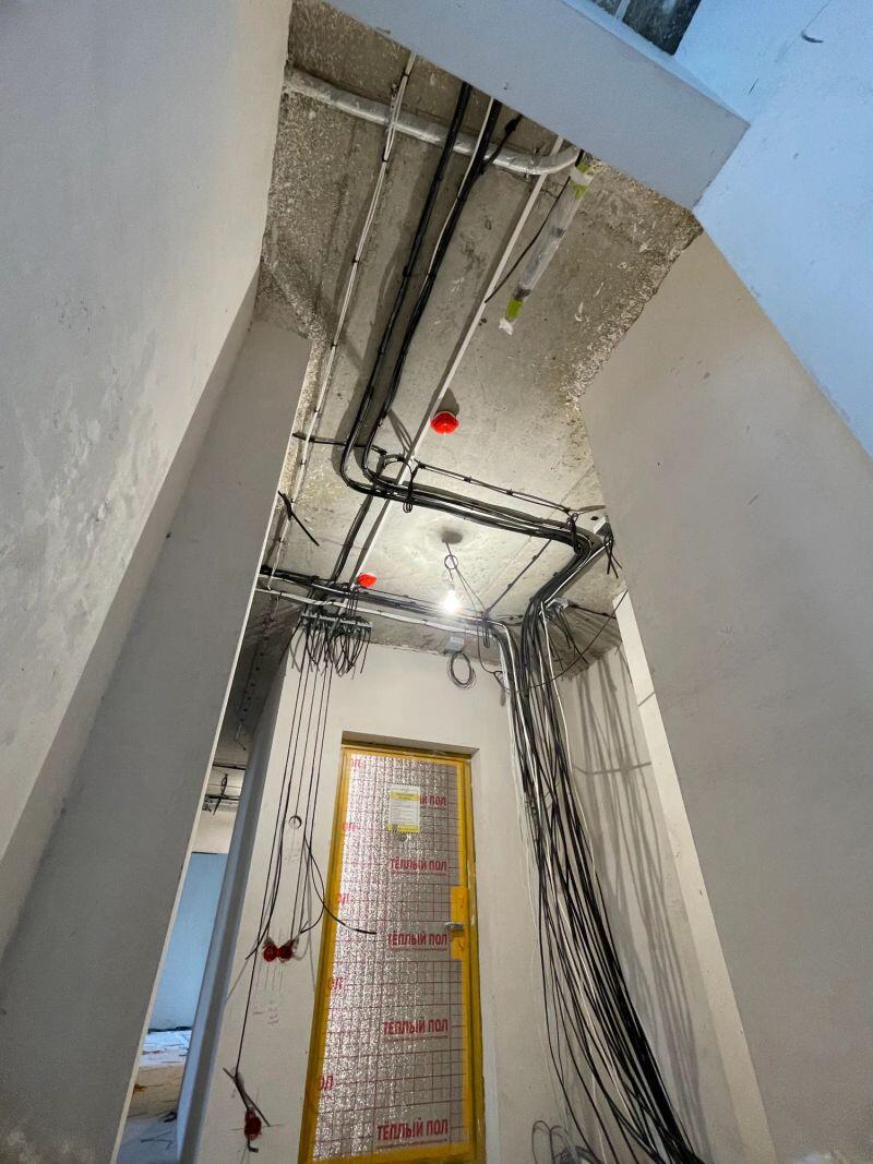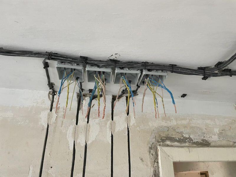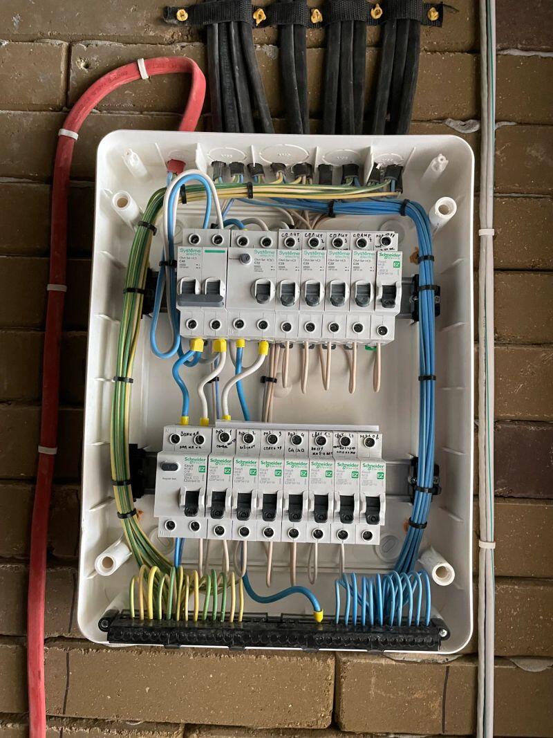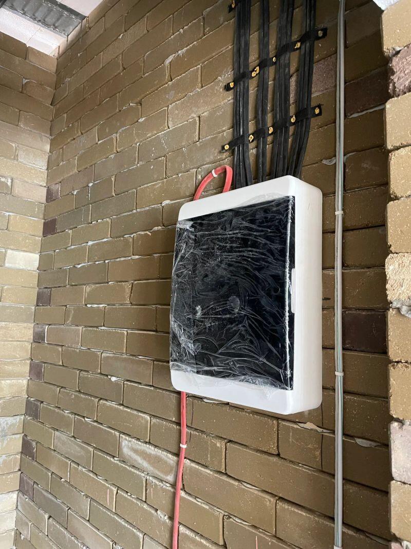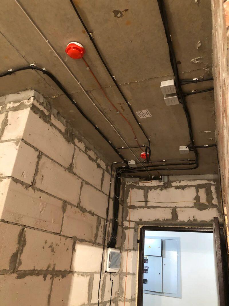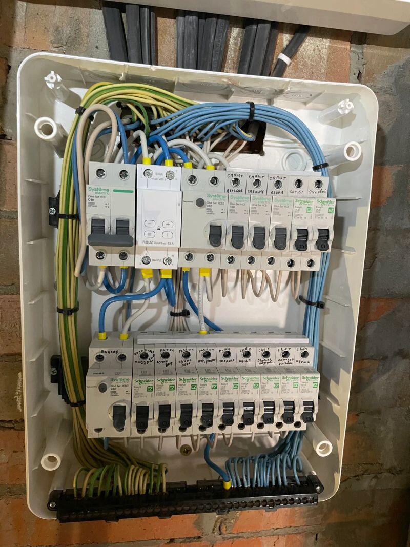 Полностью меняли проводку в студии (≈30 м²) от застройщика, добавляли розетки и выводы, меняли щиток.