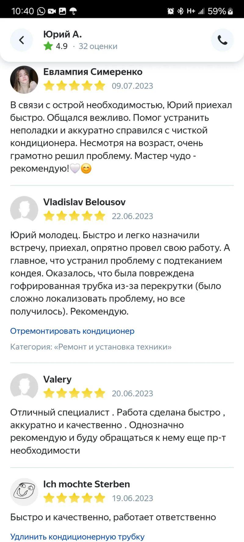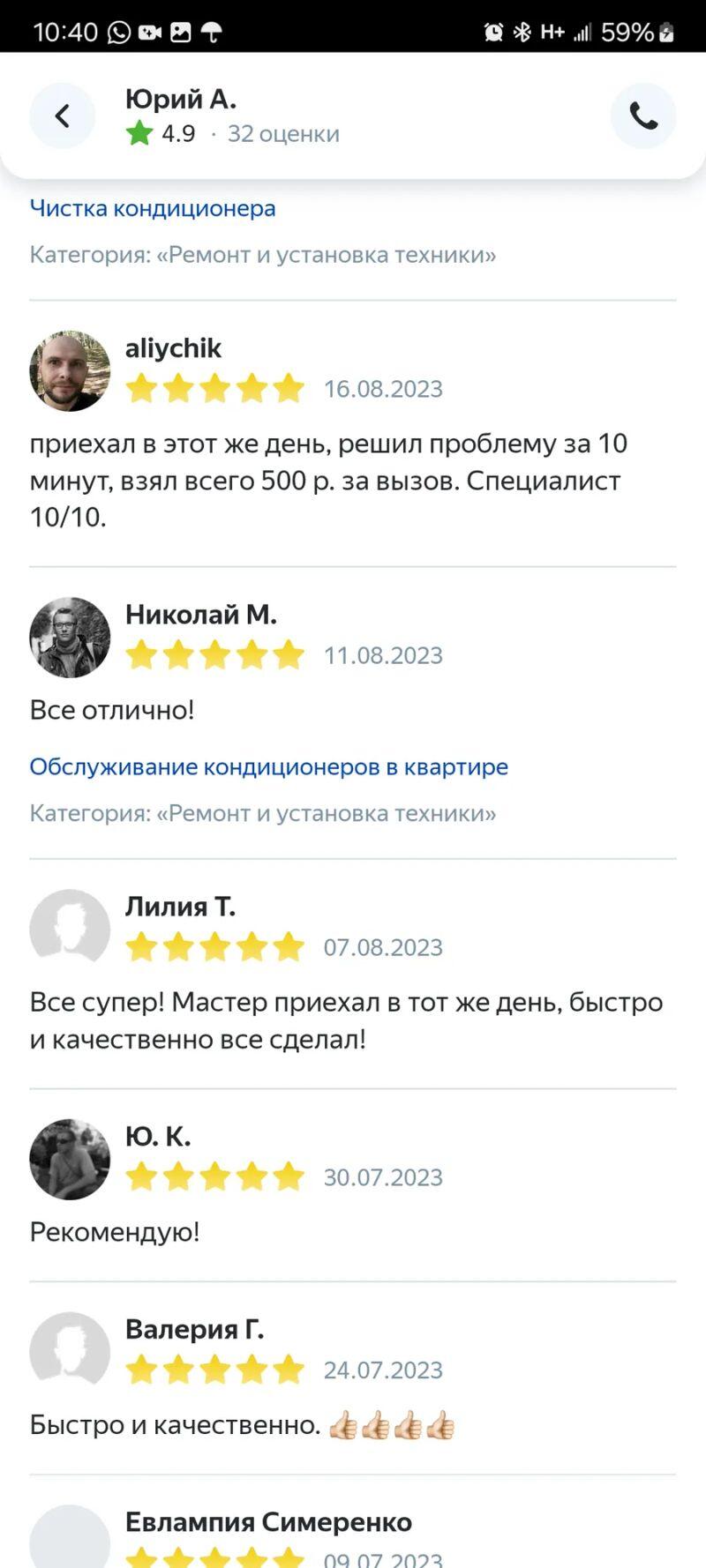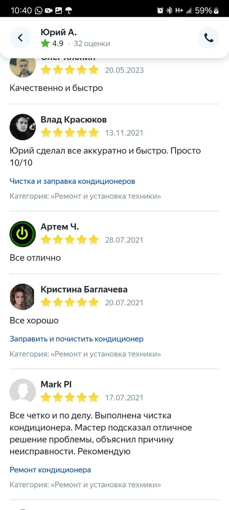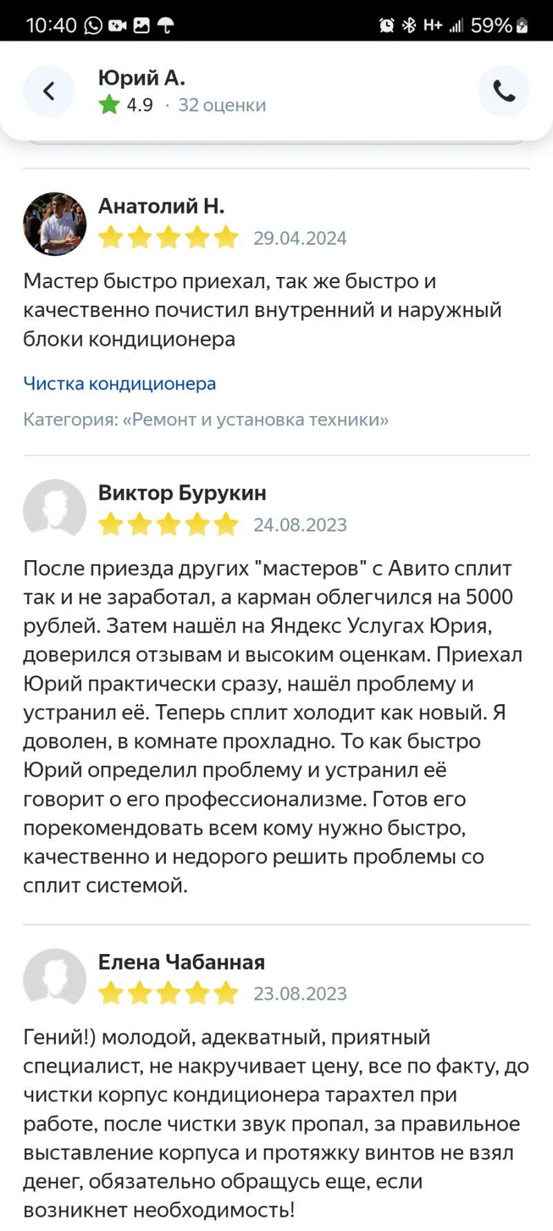 Хотел бы выразить огромную благодарность Юрию за качество чистоту и скорость работы. Был заказ на 2 кондиционера. Юрий приехал в обговоренное время. Со знанием дела принялся за работу без лишних разговоров и вопросов. Почистил, обработал дезинфицирующим средством оба кондиционера, меньше чем за час. Так же не навязывал лишних дополнительных услуг после проведенной основной работы. Изначально обсуждалась возможность заполнить их фреоном, но не потребовалось.