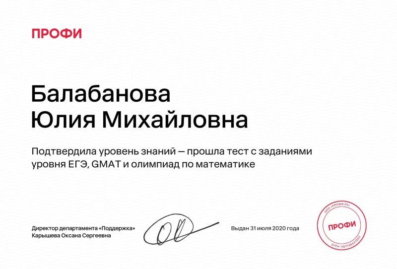- Подтвердила уровень знаний — Прошла тест с заданиями уровня ЕГЭ, GMAT и олимпиад по математике (с 2020 г.).