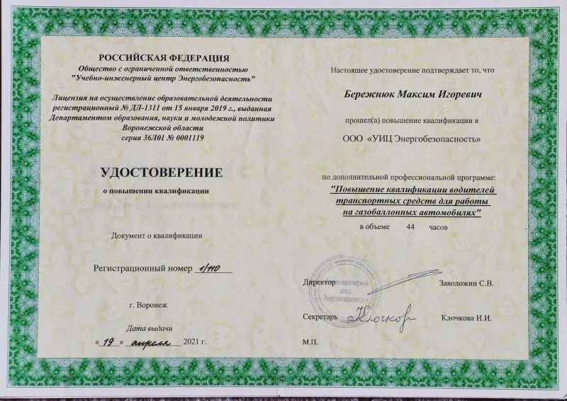 - Удостоверение о повышении квалификации, Повышение квалификации водителей для работы на газоболонных автомобилях (с 2021 г.).