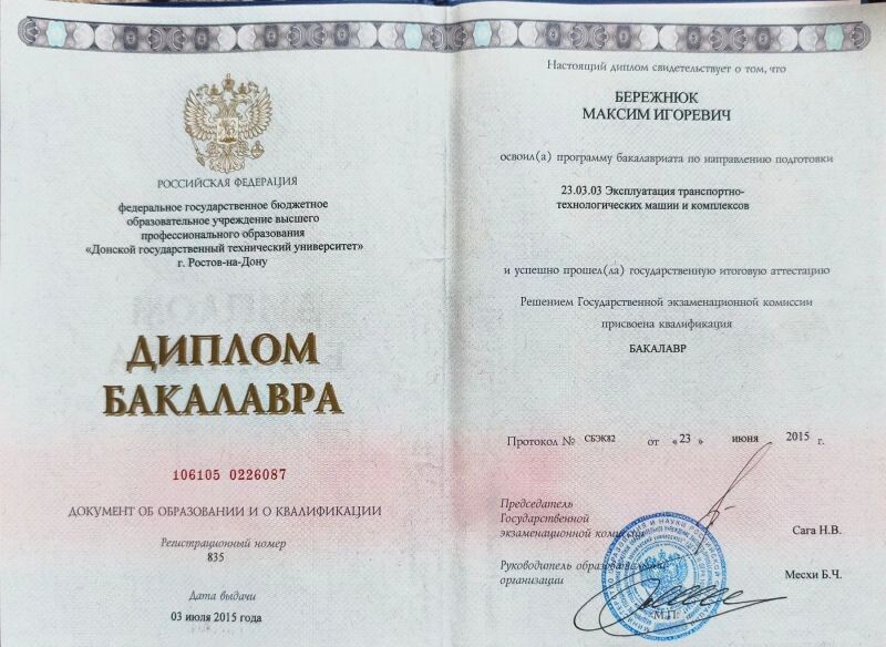 - Донской государственный технический университет, факультет Эксплуатация транспортно-технологических машин и комплексов, 2011–2015 гг.